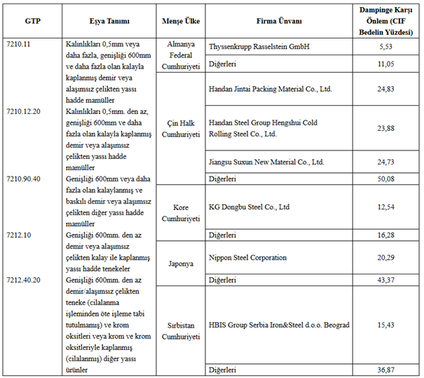 7210.11.00, 7210.12.20, 7210.90.40, 7212.10.10, 7212.10.90 ve 7212.40.20 GTİP’leri altında sınıflandırılan, kalayla kaplanmış demir veya alaşımsız çelikten yassı hadde ürünleri (teneke) ithalatında dampinge karşı kesin önlemlerin uygulanmasına karar verilmiştir.