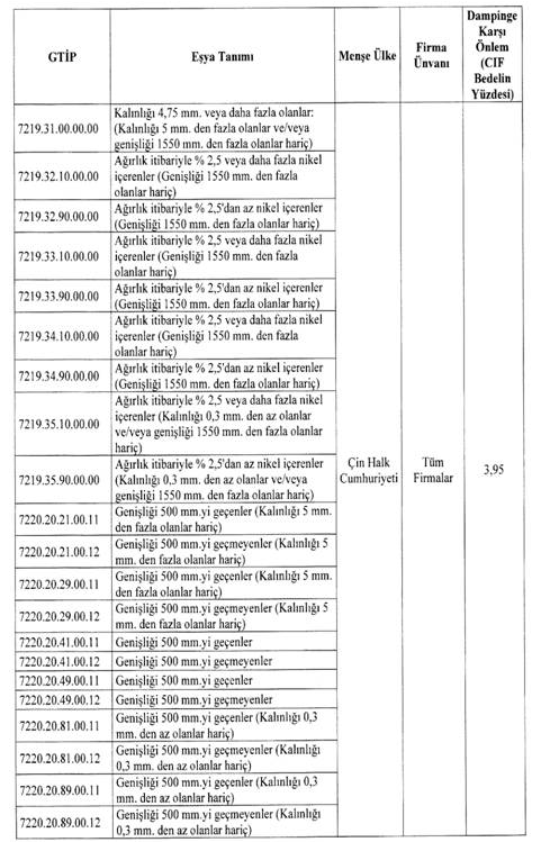 Aşağıdaki tabloda GTİP’i ve eşya tanımı yer alan “soğuk haddelenmiş paslanmaz yassı çelik ürünlerinin” ithalatında dampinge karşı kesin önlem uygulanmasına karar verilmiştir.