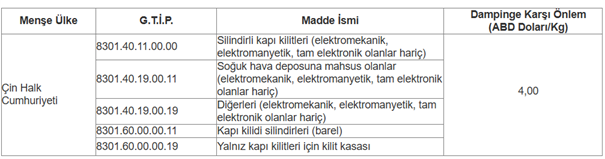 Çin menşeli "Kapı kilitleri", "kapı kilidi silindirleri (barel)" ve "kapı kilitleri için kilit kasası" ithalatına yönelik olarak uygulanan dampinge karşı verginin devamına ilişkin nihai gözden geçirme soruşturması açıldı.