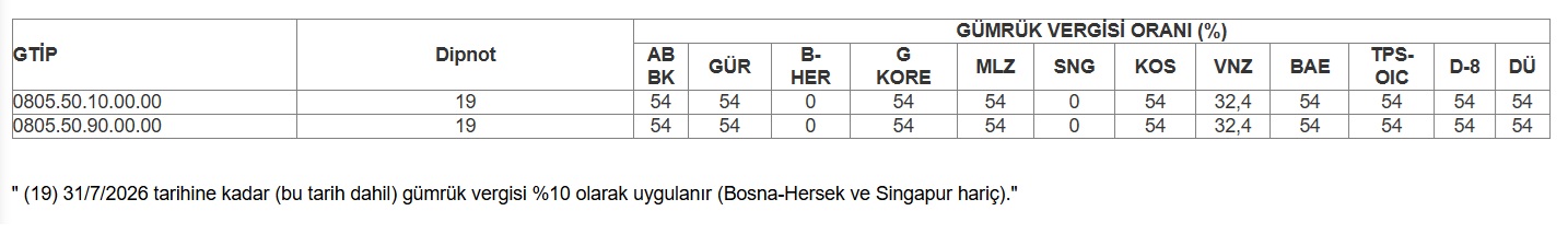 31 Temmuz 2026 tarihine kadar, "taze veya kurutulmuş limonların" ithalatında gümrük vergisi %10 olarak uygulanacaktır.