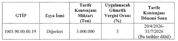 Mısır (Tarım Ürünü) İthalatında Gümrük Vergisi 20 Nisan 2026 – 31 Temmuz 2026 tarihleri arasında %5 olarak uygulanacak.
