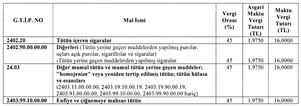 ÖTV III sayılı listenin B cetvelinde yer alan bazı eşyalara (sigara, puro ve çiğneme tütünü gibi) ötv oranı ile asgari maktu ve maktu vergi tutarları güncellenmiştir.