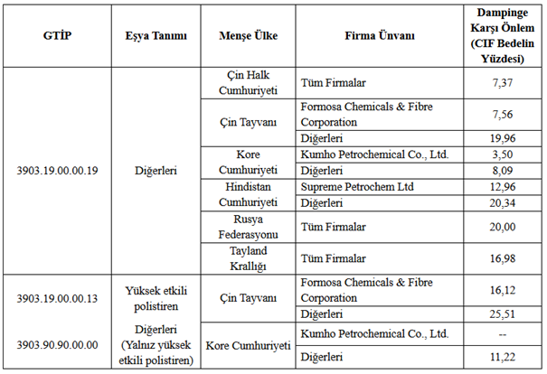 🔷Çin Halk Cumhuriyeti, Çin Tayvanı, Hindistan Cumhuriyeti, Kore Cumhuriyeti, Rusya Federasyonu ve Tayland Krallığı menşeli 3903.19.00.00.00 ve 3903.90.90.00.00 gümrük tarife istatistik pozisyonları altında sınıflandırılan “diğerleri” meyanında “Polistiren” tanımlı ürününe yönelik açılan damping soruşturması neticesinde dampingli olduğu ve yerli üretim dalında maddi zarara neden olduğu tespit edilmiştir.
