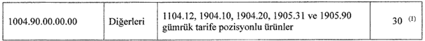 1004.90.00.00.00 GTİP’te sınıflandırılan “Tohumluk olmayan yulaf” 30 Nisan 2026 tarihine kadar (bu tarih dâhil) geçerli olmak üzere aşağıda belirtilen GTİP ve tanımlı ürünlerin üretim süreçlerinde kullanılması durumunda, nihai kullanım taahhüdü ve kontrolü altında, ilgili dönem boyunca %30 oranında gümrük vergisi uygulanacaktır.